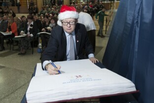 Oficjalne otwarcie 50. boiska ze sztuczną nawierzchnią. Gdańsk Zaspa, ZKPiG nr 13 przy ul. Startowej. Nz. Prezydent Gdańska Paweł Adamowicz kroi okolicznościowy tort z mapką zmodernizowanych boisk na terenie Gdańska