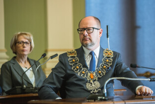 Gdańsk, Nowy Ratusz. 59. sesja Rady Miasta Gdańska. Nz. Prezydent Gdańska Paweł Adamowicz