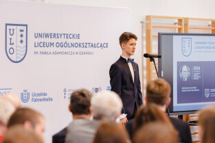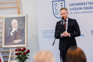 Gdańsk, ul. Traugutta. 5. rocznica śmierci prezydenta Gdańska. Dzień Patrona - Uniwersyteckie Liceum Ogólnokształcące im. Pawła Adamowicza. Nz. dr Piotr Szeląg