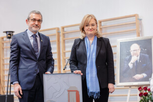 Gdańsk, ul. Traugutta. 5. rocznica śmierci prezydenta Gdańska. Dzień Patrona - Uniwersyteckie Liceum Ogólnokształcące im. Pawła Adamowicza. Nz. posłanka Magdalena Adamowicz i dyrektor Waldemar Kotowski.