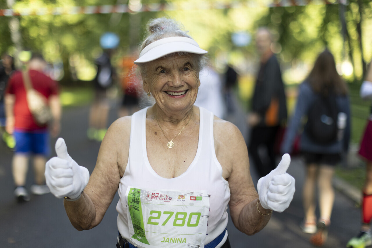 Gdańsk. 63. Bieg Westerplatte. Nz. 89 letnia Joanna Rosińska, najstarsza uczestniczka biegu.