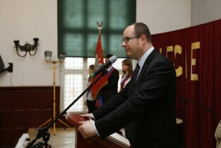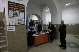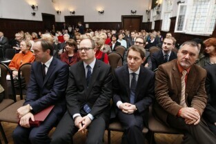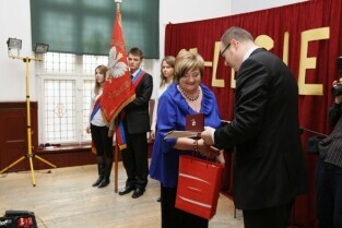 65-lecie III Liceum Ogólnokształcącego ("Topolówki") w Gdańsku. Nz. od lewej: Marszałek Woj. Pomorskiego Mieczysław Struk, Prezydent Gdańska Paweł Adamowicz, W-ce Wojewoda Pomorski Michał Owczarczak, Przewodniczący Komisji Edukacji RMG Piotr Gierszewski