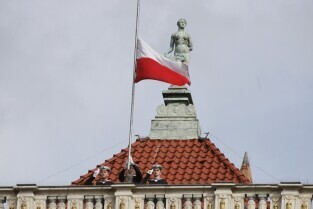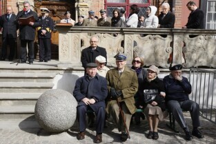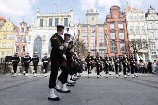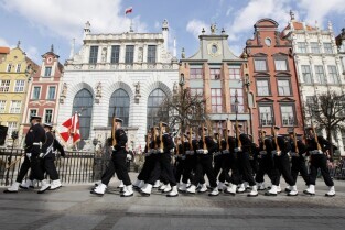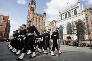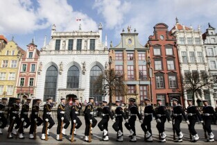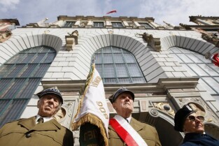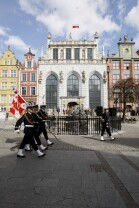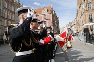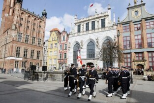 Gdańsk, Długi Targ. 67. rocznica zawieszenia biało - czerwonego sztandaru na Dworze Artusa i "Powrotu Gdańska do Macierzy"