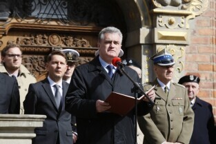 Gdańsk, Długi Targ. 67. rocznica zawieszenia biało - czerwonego sztandaru na Dworze Artusa i "Powrotu Gdańska do Macierzy". Nz. przemawia Przewodniczący Rady Miasta Gdańska Bogdan Oleszek