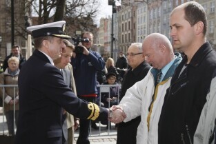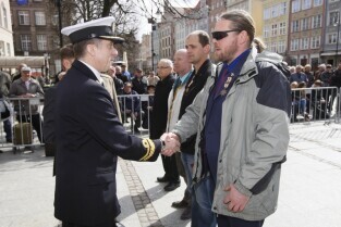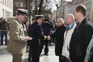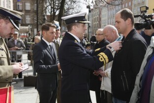 Gdańsk, Długi Targ. 67. rocznica zawieszenia biało - czerwonego sztandaru na Dworze Artusa i "Powrotu Gdańska do Macierzy". Nz. Szef Szkolenia Marynarki Wojennej kontradmirał Ryszard Demczuk wręcza żołnierzom odznaczenia Gwiazda Iraku i Gwiazda Afganistanu