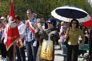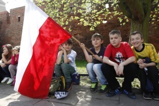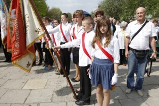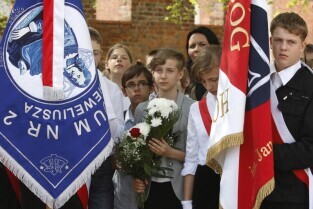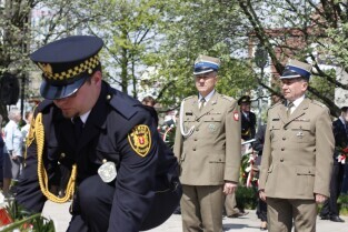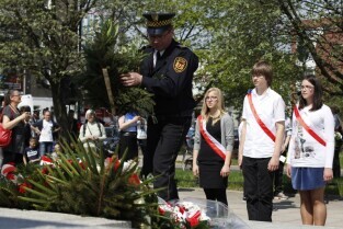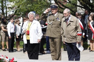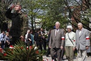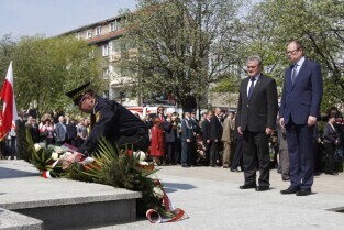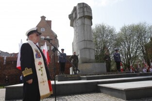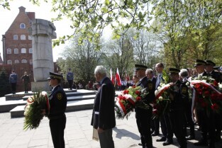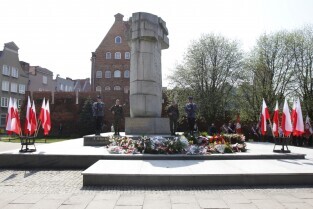Uroczystość 68. rocznicy zakończenia II Wojny Światowej. Gdańsk, Podwale Staromiejskie, pomnik "Tym, co za polskość Gdańska"