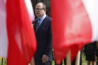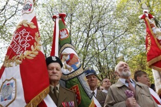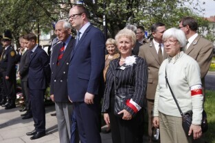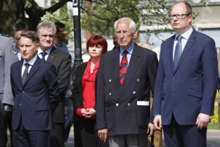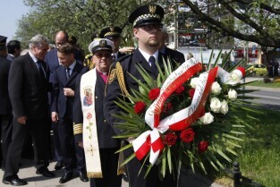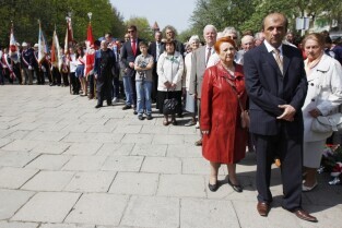 Uroczystość 68. rocznicy zakończenia II Wojny Światowej. Gdańsk, Podwale Staromiejskie, pomnik "Tym, co za polskość Gdańska". Nz. Prezydent Gdańska Paweł Adamowicz