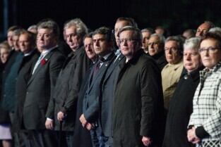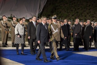 Gdańsk Westerplatte. Uroczystość upamiętniająca 70. rocznicę zakończenia II Wojny Światowej. Nz. Prezydent RP Bronisław Komorowski, z tyłu Premier RP Ewa Kopacz i Prezydent Ukrainy Petro Poroszenko
