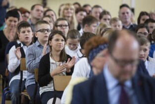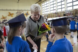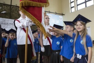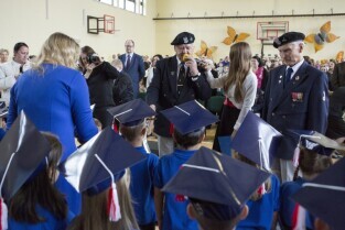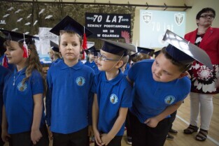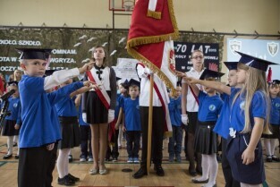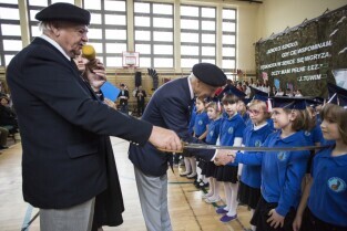 Gdańsk Niedźwiednik. Uroczystość 70-lecia Szkoły Podstawowej nr 38 im. Generała Stanisława Maczka. Nz. pasowanie na ucznia klas pierwszych