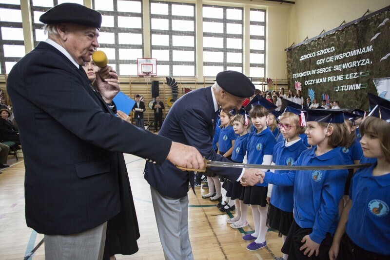 Gdańsk Niedźwiednik. Uroczystość 70-lecia Szkoły Podstawowej nr 38 im. Generała Stanisława Maczka. Nz. pasowanie na ucznia klas pierwszych