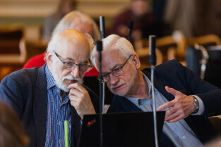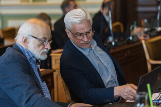 Gdańsk, ul Wały jagiellońskie. 70. sesja Rady Miasta Gdańska. Nz. radni (od prawej) Andrzej Kowalczys i Cezary Śpiewak-Dowbór