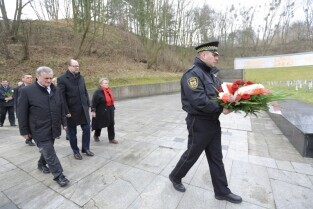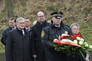 Gdańsk. Obchody 72. rocznicy powrotu Gdańska do Macierzy. Uroczystość na Cmentarzu Żołnierzy Radzieckich. Nz. Przewodniczący Rady Miasta Bogdan Oleszek, Prezydent Gdańska Paweł Adamowicz i Radna Teresa Wasilewska.