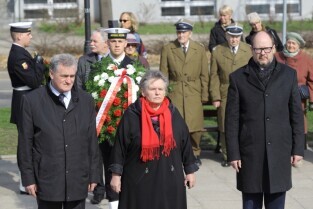 Gdańsk. Obchody 72. rocznicy powrotu Gdańska do Macierzy. Uroczystość pod Pomnikiem „Tym co za polskość Gdańska”. Nz. Nz. Przewodniczący Rady Miasta Bogdan Oleszek, Radna Teresa Wasilewska i Prezydent Gdańska Paweł Adamowicz.