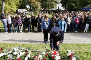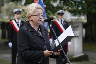 Gdańsk, Cmentarz - Pomnik Bohaterów 'Zaspa". Obchody 73. rocznicy rozstrzelania Obrońców Poczty Polskiej w Gdańsku. Nz. Z-ca Prezydenta Gdańska Ewa Kamińska