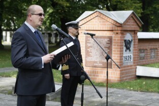 Gdańsk, Cmentarz - Pomnik Bohaterów 'Zaspa". Obchody 73. rocznicy rozstrzelania Obrońców Poczty Polskiej w Gdańsku. Nz. Członek Zarządu Poczty Polskiej S.A. Paweł Włoch