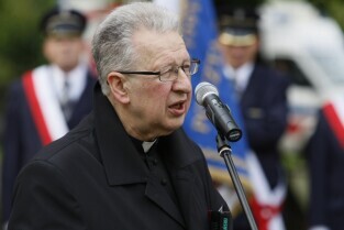 Gdańsk, Cmentarz - Pomnik Bohaterów 'Zaspa". Obchody 73. rocznicy rozstrzelania Obrońców Poczty Polskiej w Gdańsku. Nz. proboszcz parafii pw. Św. Antoniego Padewskiego ks. Bernard Zieliński