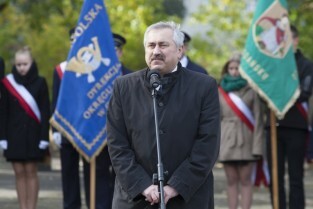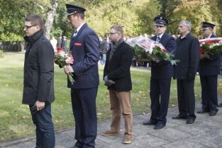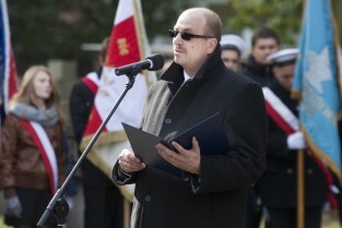 Gdańsk, Cmentarz - Pomnik Bohaterów 'Zaspa". Obchody 74. rocznicy rozstrzelania Obrońców Poczty Polskiej w Gdańsku. Nz. Wiceprzewodniczący Rady Miasta Gdańska Jacek Teodorczyk