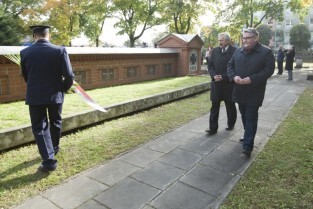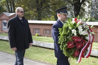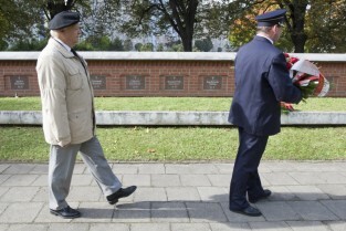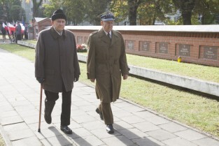 Gdańsk, Cmentarz - Pomnik Bohaterów 'Zaspa". Obchody 74. rocznicy rozstrzelania Obrońców Poczty Polskiej w Gdańsku. Nz. od prawej Z-ca Dyrektora Wydziału Edukacji UMG Piotr Kowalczuk i Wiceprzewodniczący Rady Miasta Gdańska Jacek Teodorczyk