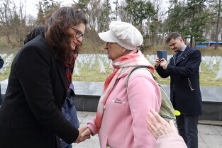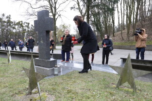 Gdańsk. Uroczystości 74. rocznicy powrotu Gdańska do Macierzy. Składanie kwiatów przy „Pomniku Matki Polki i Rosjanki” na Cmentarzu Wojennym Żołnierzy Radziecki w Gdańsku. Nz. Prezydent Gdańska Aleksandra Dulkiewicz.