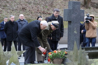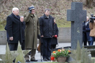 Gdańsk. Uroczystości 74. rocznicy powrotu Gdańska do Macierzy. Składanie wieńców pod pomnikiem „Tym Co Za Polskość Gdańska”. Nz. Radni: Romuald Plewa i Kacper Płażyński.