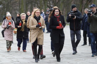Gdańsk. Uroczystości 74. rocznicy powrotu Gdańska do Macierzy. Składanie kwiatów przy „Pomniku Matki Polki i Rosjanki” na Cmentarzu Wojennym Żołnierzy Radziecki w Gdańsku. Nz. Przewodnicząca Rady Miasta Agnieszka Owczarczak i Prezydent Gdańska Aleksandra Dulkiewicz.