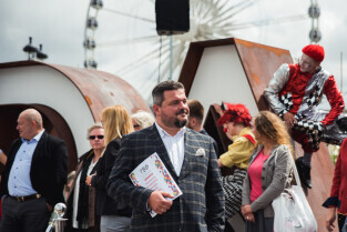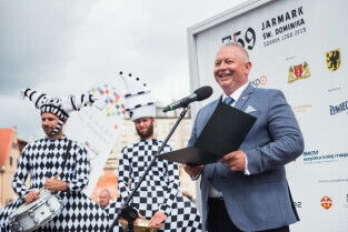 Gdańsk. 759. Jarmark św. Dominika - konferencja prasowa na Ołowiance. Nz. Tomasz Jakubiak