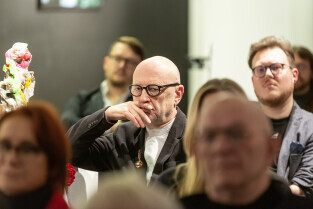 Gdańsk. W auli Akademii Sztuk Pięknych w Gdańsku odbyło się święto uczelni związane z 77 rocznicą jej powstania. Nz. Wystąpienie JM Rektora prof. ASP dra hab. Krzysztofa Polkowskiego.