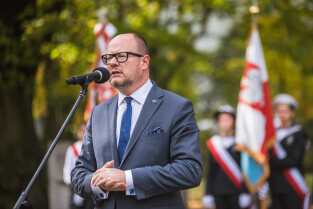 Gdańsk, cmentarz pocztowców na Zaspie. 79. rocznica rozstrzelania Obrońców Poczty Polskiej w Gdańsku. Nz. Prezydent Gdańska Paweł Adamowicz