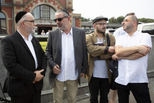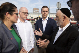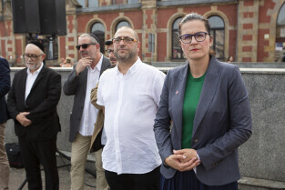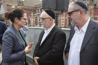80. rocznica ewakuacji ostatniej grupy żydowskich dzieci w ramach akcji Kindertransportów. Gdańsk, Dworzec PKP. Nz. przewodniczący Zarządu Gminy Wyznaniowej Żydowskiej w Gdańsku Michał Samet, prezydent Gdańska Aleksandra Dulkiewicz, radni miasta Gdańska Kazimierz Koralewski i Cezary Dowbor-Śpiewak