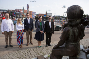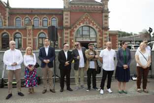 80. rocznica ewakuacji ostatniej grupy żydowskich dzieci w ramach akcji Kindertransportów. Gdańsk, Dworzec PKP. Nz. prezydent Gdańska Aleksandra Dulkiewicz, radni miasta Gdańska Kazimierz Koralewski, Beata Dunajewska i Cezary Dowbor-Śpiewak oraz przewodniczący Zarządu Gminy Wyznaniowej Żydowskiej w Gdańsku Michał Samet