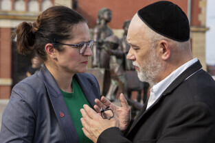 80. rocznica ewakuacji ostatniej grupy żydowskich dzieci w ramach akcji Kindertransportów. Gdańsk, Dworzec PKP. Nz. przewodniczący Zarządu Gminy Wyznaniowej Żydowskiej w Gdańsku Michał Samet i prezydent Gdańska Aleksandra Dulkiewicz