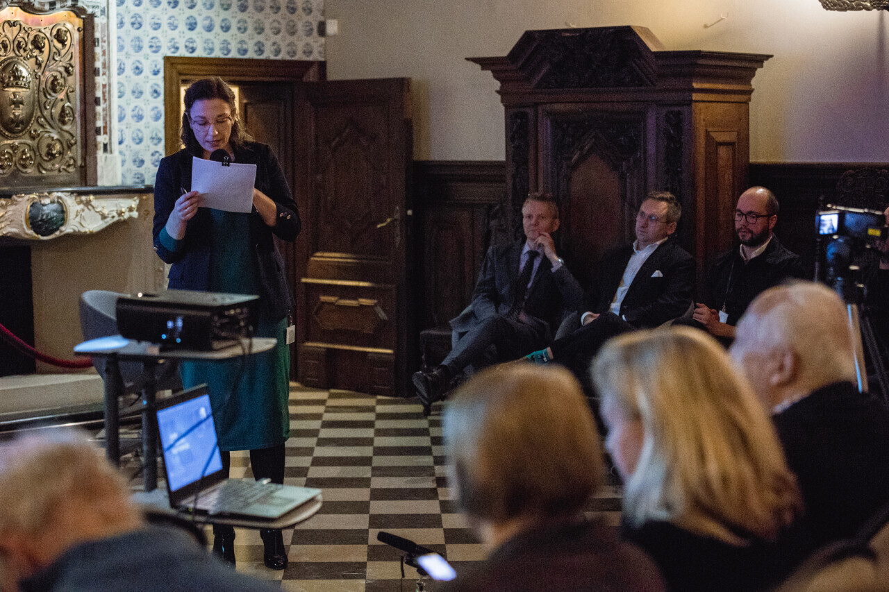 Gdańsk, Dwor Artusa. 84. rocznica nocy kryształowej w Gdańsku. W spotkaniu wzięli udział dr Jan Daniluk, dr Mieczysław Abramowicz oraz Izabela Jastrzembska-Olkowska i Klaudiusz Grabowski