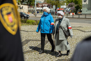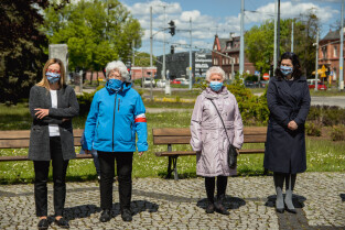 Gdańsk, Pomnik Józefa Piłsudskiego. 85. rocznica śmierci marszałka Józefa Piłsudskiego. Nz. (od lewej) przewodnicząca rady miasta Gdańska Agnieszka Owczarczak, prezes stowarzyszenia Rodzina Ponarska, Maria Wieloch, Hanna Śliwa-Wielesiuk, prezes Stowarzyszenia Rodzin Katyńskich w Gdańsku, Prezydent Gdańska Aleksandra Dulkiewicz