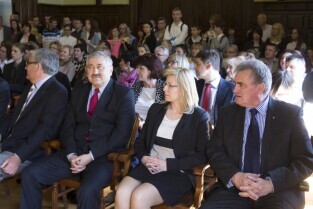 XIV Gdańska Edycja Samorządowego Konkursu Ośmiu Wspaniałych, w którym nagradzani są uczniowie szkół za bezinteresowną pomoc innym. Gdańsk, Nowy Ratusz. Nz. od prawej: Przewodniczący Rady Miasta Gdańska Bogdan Oleszek, Prorektor ds. Kształcenia Uniwersytetu Gdańskiego Anna Machnikowska, Wiceprzewodniczący Rady Miasta Gdańska Jacek Teodorczyk
