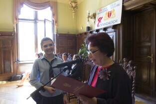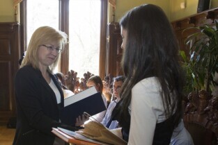 XIV Gdańska Edycja Samorządowego Konkursu Ośmiu Wspaniałych, w którym nagradzani są uczniowie szkół za bezinteresowną pomoc innym. Gdańsk, Nowy Ratusz. Nz. nagrody laureatom wręcza Prorektor ds. Kształcenia Uniwersytetu Gdańskiego Anna Machnikowska