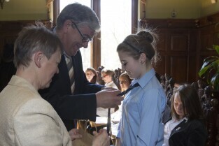 XIV Gdańska Edycja Samorządowego Konkursu Ośmiu Wspaniałych, w którym nagradzani są uczniowie szkół za bezinteresowną pomoc innym. Gdańsk, Nowy Ratusz. Nz. Prezes Krajowej Izby Gospodarczej Bursztynu Zbiegniew Strzelczyk przypina nagrodzonym bursztynowe broszki w kształcie symbolicznej cyfry "8"