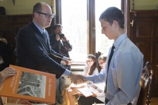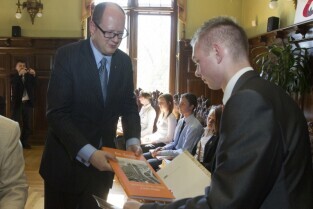 XIV Gdańska Edycja Samorządowego Konkursu Ośmiu Wspaniałych, w którym nagradzani są uczniowie szkół za bezinteresowną pomoc innym. Gdańsk, Nowy Ratusz. Nz. nagrody laureatom wręcza Prezydent Gdańska Paweł Adamowicz