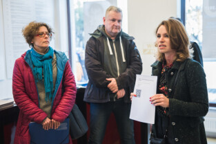 Gdańsk. 90. urodziny Güntera Grassa. Interaktywny spacer po miejscach bliskich Grassowi. Nz. (po lewej) przewodniczka Anna Kowalewska-Mróz i Marta Wróblewska (po prawej)