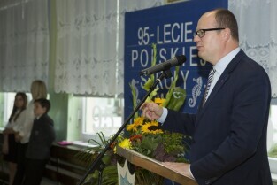 Gdańsk Osowa. Obchody 95-lecia Szkoły Podstawowej nr 81 połączone z otwarciem zmodernizowanych obiektów i Dniem Edukacji Narodowej. Nz. Prezydent Gdańska Paweł Adamowicz