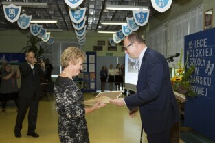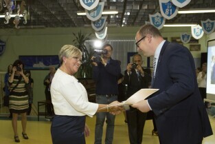 Gdańsk Osowa. Obchody 95-lecia Szkoły Podstawowej nr 81 połączone z otwarciem zmodernizowanych obiektów i Dniem Edukacji Narodowej. Nz. Prezydent Gdańska Paweł Adamowicz wręcza okolicznościową nagrodę, którą otrzymuje Dyrektor SP 81 Mariola Cyranek