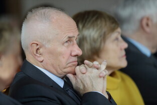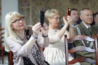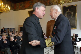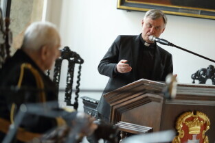 Gdańsk, Wielka Sala Wety, Ratusz Głównego Miasta. 95. urodziny kmdr. Romana Rakowskiego. Nz. Ks. Ireneusz Bradtke.