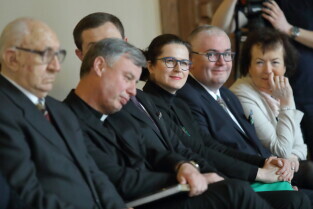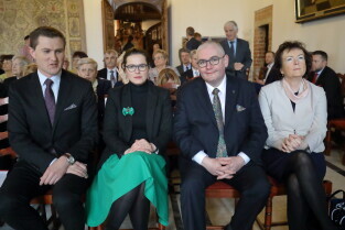 Gdańsk, Wielka Sala Wety, Ratusz Głównego Miasta. 95. urodziny kmdr. Romana Rakowskiego. Nz. Wiceprezydent Gdańska Piotr Grzelak, Prezydent Gdańska Aleksandra Dulkiewicz, Wiceprezydent Gdańska Piotr Kowalczuk i Posłanka Hanna Zych-Cisoń.