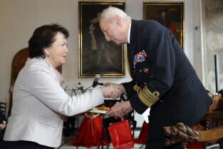 Gdańsk, Wielka Sala Wety, Ratusz Głównego Miasta. 95. urodziny kmdr. Romana Rakowskiego. Nz. Posłanka Hanna Zych-Cisoń i kmdr. Roman Rakowski.