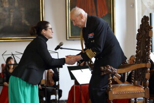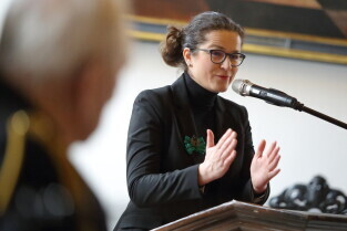 Gdańsk, Wielka Sala Wety, Ratusz Głównego Miasta. 95. urodziny kmdr. Romana Rakowskiego. Nz. Prezydent Gdańska Aleksandra Dulkiewicz.