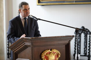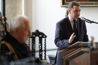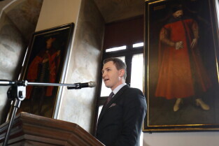 Gdańsk, Wielka Sala Wety, Ratusz Głównego Miasta. 95. urodziny kmdr. Romana Rakowskiego. Nz. Wiceprezydent Gdańska Piotr Grzelak.