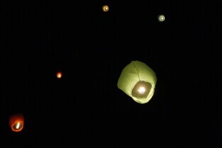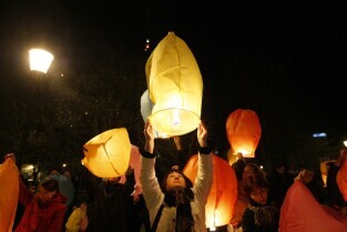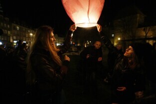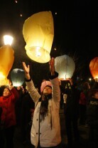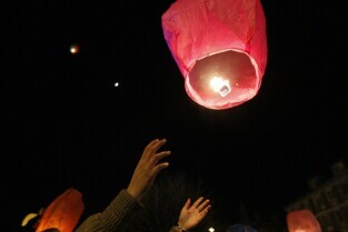 Akcja Stowarzyszenia Młody Gdańsk upamiętniająca 96 ofiar katastrofy samolotu prezydenckiego pod Smoleńskiem, poprzez wypuszczenie w niebo 96 lampionów. Gdańsk, Plac Dariusza Kobzdeja