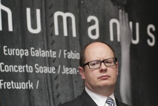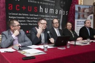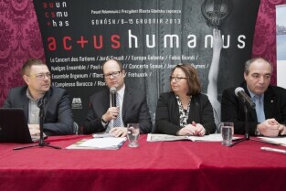Gdańsk, Dom Uphagena. Konferencja prasowa poświęcona organizacji festiwalu muzyki dawnej "Actus Humanus". Nz. od lewej: Dyrektor Artystyczny Festiwalu Filip Berkowicz, Prezydent Gdańska Paweł Adamowicz, Dyrektor Biura Prezydenta Gdańska ds. Kultury Anna Czekanowicz-Drążewska, Prezes Saur Neptun Gdańsk Serge Bosca