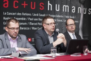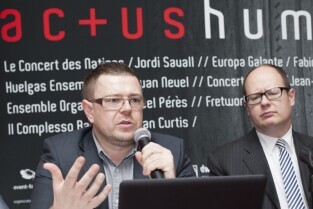 Gdańsk, Dom Uphagena. Konferencja prasowa poświęcona organizacji festiwalu muzyki dawnej "Actus Humanus". Nz. Dyrektor Artystyczny Festiwalu Filip Berkowicz