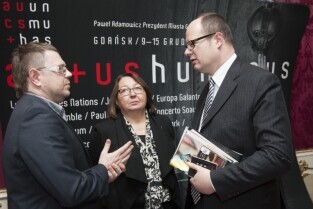 Gdańsk, Dom Uphagena. Konferencja prasowa poświęcona organizacji festiwalu muzyki dawnej "Actus Humanus". Nz. Dyrektor Artystyczny Festiwalu Filip Berkowicz (po lewej) i Prezydent Gdańska Paweł Adamowicz (po prawej), po środku Dyrektor Biura Prezydenta Gdańska ds. Kultury Anna Czekanowicz-Drążewska