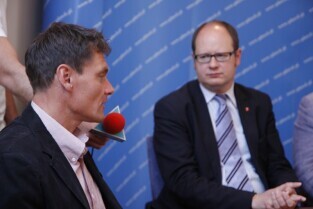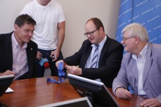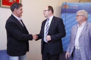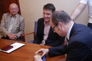 Urząd Miejski w Gdańsku. Adam Korol ze złotym medalem Mistrzostw Europy we wioślarstwie na spotkaniu z Prezydentem Gdańska Pawłem Adamowiczem.